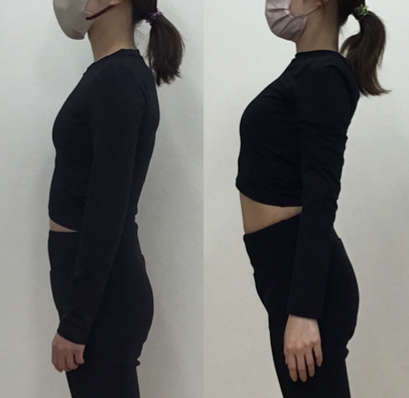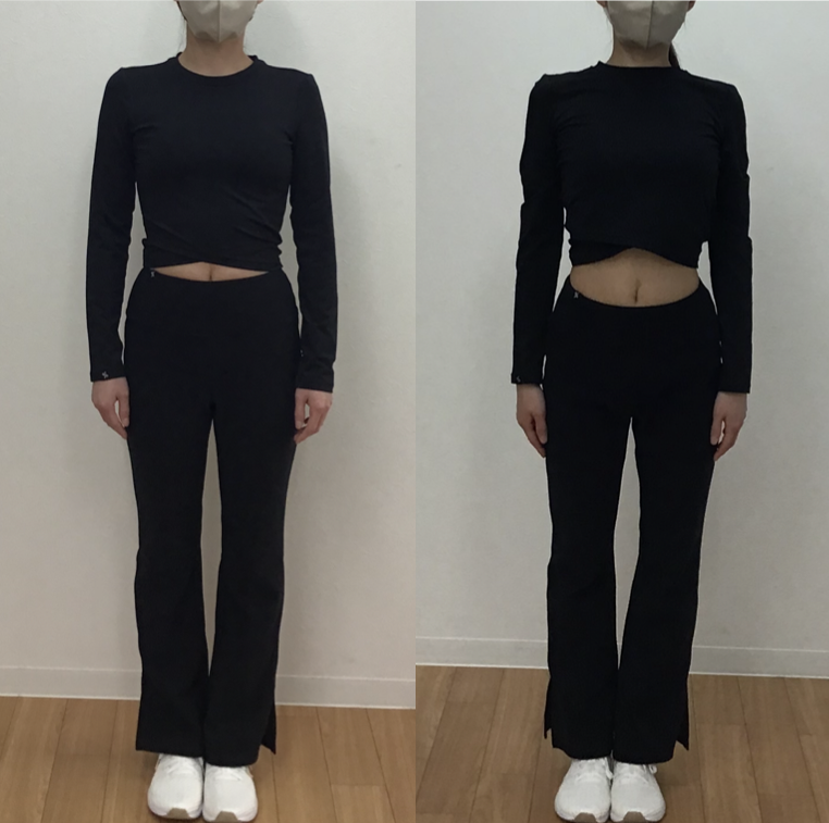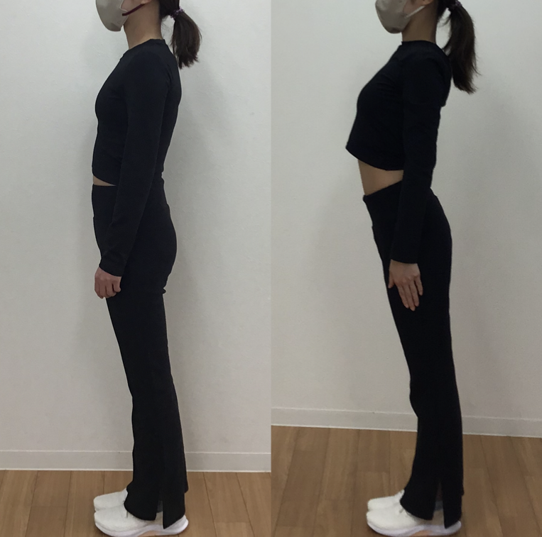 横からのお写真では、姿勢が改善していることが分かります。姿勢を良くしようと思っても良くできませんでしたが、良い姿勢になることができるようになりました。また、ぽっこりとしたお腹(特に下腹部)がへこんできていたり、少しヒップアップしてきていることも分かります。