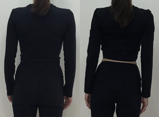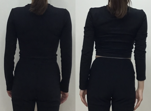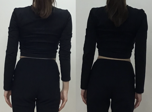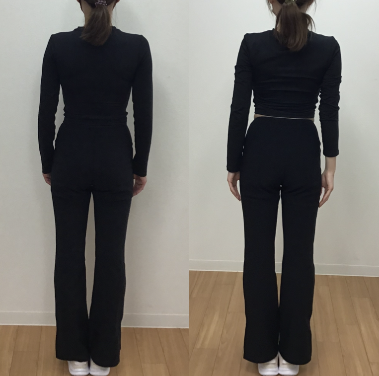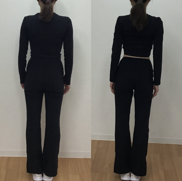 後ろからのお写真では、両方の写真共に肌がほとんど見えていないので比較がしやすいです。お写真の比較がしやすいので、トレーニング開始時よりも約3ヶ月後の方がウエストの横幅が少し細くなっていることが分かります。