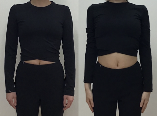 約3ヶ月後の写真では、姿勢が良くなったせいか服の位置が変わりお腹が見えるようになっています。肌の色が白く膨張色であることに加えて、トレーニング開始時の写真はお腹が見えていないので、ウエストの変化は分かりにくいです。