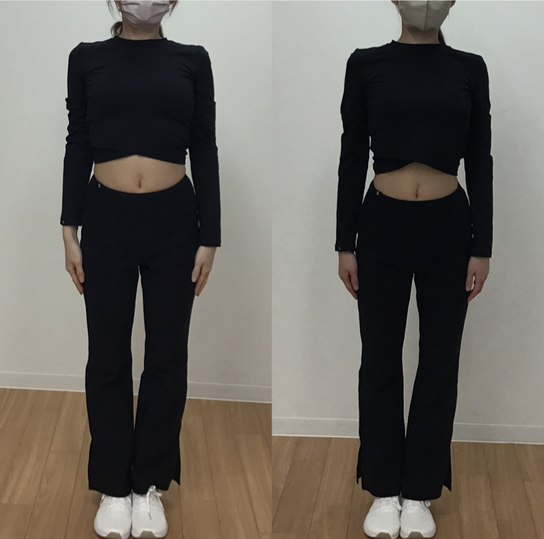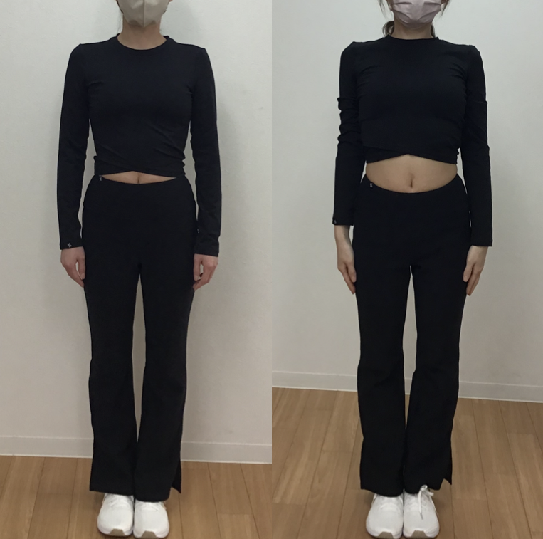 次に写真の確認です。片方の写真だけ姿勢を良くすると正確に体の変化を見られないので、両方の写真共にできるだけ姿勢を良くしていただきながら撮影をしています。それでは写真を見ていきます。